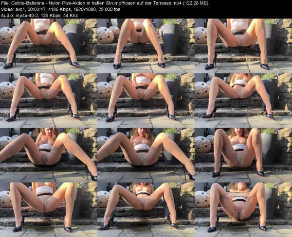 Celina-Ballerina drenches her nylon pantyhose on the terrace, a hot piss action fetish clip in shiny tights.