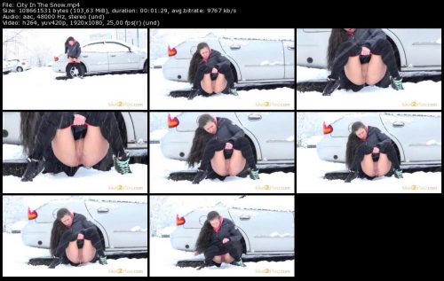 Today’s update on Got2Pee features a hot brunette who is also in the heavy snow! She rushes through the city and finds some parked cars before squatting to pee. Showing her bare pussy, this sexy babe relieves her piss desperation while we zoom in really close on her stream.