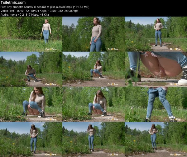 Shy brunette squats in denims to piss outside