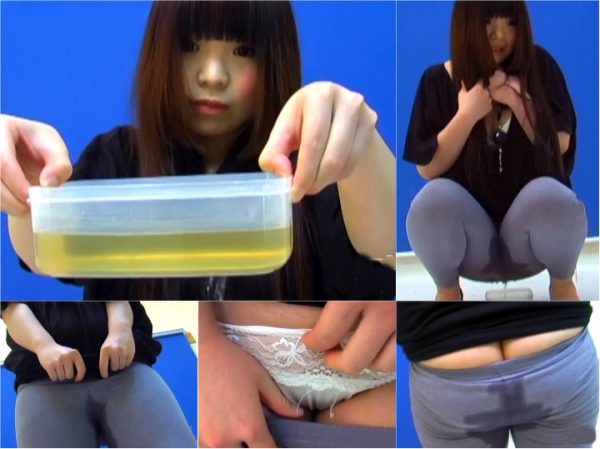 Hands moving to her crotch, she grimaces a bit, then signals it’s time as a dark wet stain spreads down her legs. She squats and sprays though her tights, smiling shyly. As the plastic container fills up, she covers her face with her fingers, then turns for the camera to close in on her pretty rump and drenched gray tights. She holds the piss container for the camera with a quizzical expression.